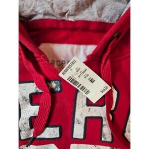 This Vintage Aeropostale Hoodie is a Men's Large sweatshirt with a graphic print featuring a mall theme from the Y2K era. The red hoodie has a zip closure, long sleeves, and comes with a hood for added warmth. Made of polyester, this regular fit pullover hoodie is machine washable and suitable for all seasons. It also includes accents like a zipper and the Aeropostale logo, perfect for fans of 90s skate culture and music genres like music, grunge, and hip hop. Ideal for activities such as gym training, walking, and running.