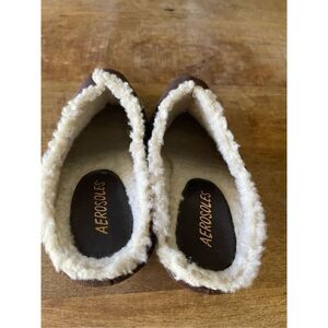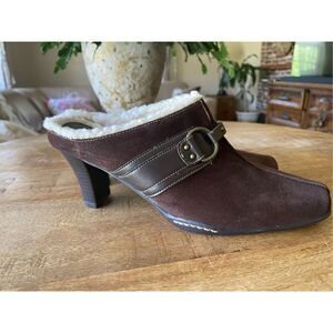 Vintage Aerosoles Pumps Womens Shearling Mule Block High Heels Brown Suede Comfo
