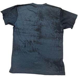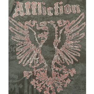 This vintage Affliction tee is in good used condition, with a cool distressed look. Please note a few tiny stains on the bottom of the shirt, as shown in the images. Adds character to this unique piece!