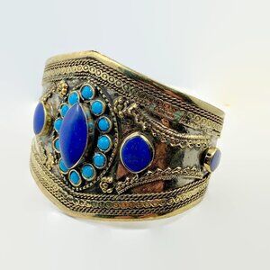 Wow, this is massive and stunning! This beauty is inlaid with a blue centerpiece. This is an incredible vintage tribal bracelet. It is created from mixed metals. The base of the piece is silver toned and brass accents. This piece has great detail work from the patterned texture and twisted wire accents. Turquoise glass beads are set around the center. This is super wide in the front but tapers to the back so that it is more comfortable to wear. Let your bohemian style fly free with this beauty! This will fit a larger wrist so please check the measurements.
