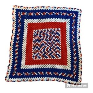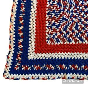Vintage Afghan Crocheted Blanket Handmade Red Blue Throw 48" x 48" Patriotic USA