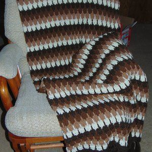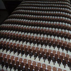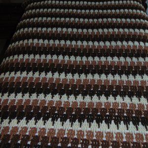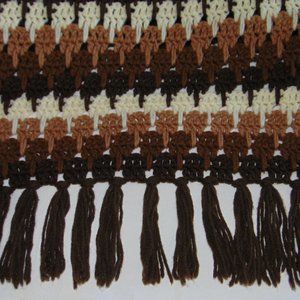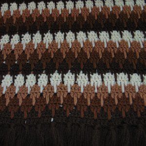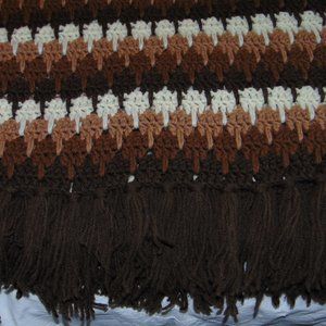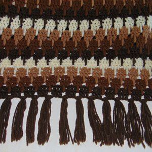 This beautiful afghan is handmade and crocheted using the following colors: Dark brown, brown, light brown and ivory. Each end (two ends) has brown tassels that are 5 inches in length.