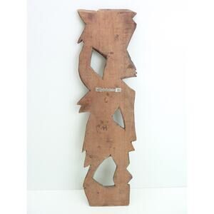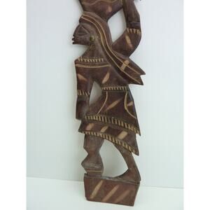 Vintage flat wood relief type carved sculpture of side profile figure with basket. Brass earring. Size is about 18" tall x 5" wide. Looks like wood was stained a reddish color and the carved to create contrasting coloring. Will be packed with care.