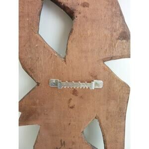 Vintage flat wood relief type carved sculpture of side profile figure with basket. Brass earring. Size is about 18" tall x 5" wide. Looks like wood was stained a reddish color and the carved to create contrasting coloring. Will be packed with care.
