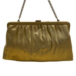 Elegant vintage gold clutch with a rhinestone bow, chain strap, and metal mesh fabric. Functional and stylish for carrying essentials.