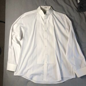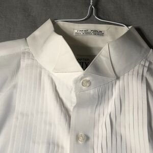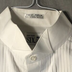 This is a classic men's white tuxedo shirt by the renowned formalwear brand, After Six. Perfect for black tie events, proms, weddings, or vintage-themed parties. This Formal Tuxedo Shirt is White with Pleated (Ruffle/Pin-tuck style) bib front. It has a Band Collar (also known as Mandarin, Nehru, or Stand-up collar) designed to be worn with a separate collar band and tie, or as-is with a bow tie. It is marked as an XL (17-17.5 collar, 35/36 sleeve) and made from the Finest Poplin - 65% Polyester, 35% Cotton blend (durable and wrinkle-resistant). It has standard convertible cuffs with additional holes near the buttons intended for use with cufflinks. Each button hole on the shirt also has both a button and a hole for shirt studs.