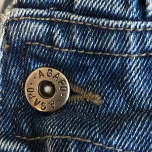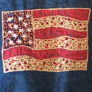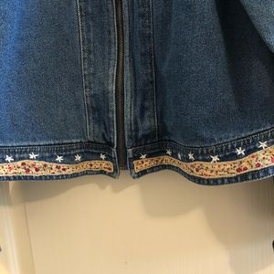 Agapo Denim Jacket W/Embroidered Patchwork Flag on Back, Zip Up, Waist Detail Includes Floral Fabric Border and Embroidered Stars (this detail is on the front to the sides) Tags have been removed but metal buttons have the Agapo name. Please see measurements for size, Good pre-owned condition, pet free/smoke free home