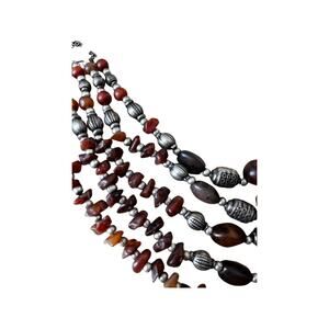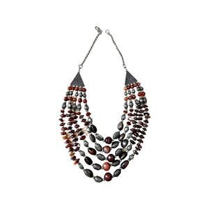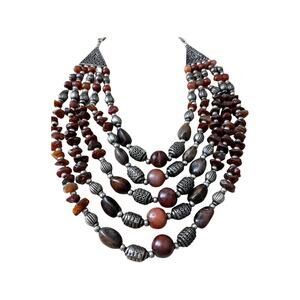 This is a gorgeous necklace made up of vintage red agate natural stone beads and silver beads. The necklace is five strands and has a lot of weight. The detailed triangles that hold the strands are stamped sterling, but the rest of the chain and beads I don’t believe are. It’s a really lovely, substantial piece.