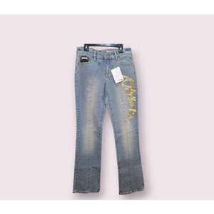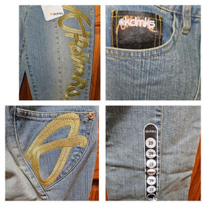 These are a pair of vintage y2k light blue denim jeans with gold embroidery. The brand is Akademiks "akdmks" and the size is 29. The jeans are new with tags.