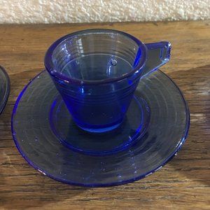 and flaws in the pieces. Rare to find the cobalt blue color. One plate had a chip right along the rim and one cup handle has a chip. There are three cups 1.5" tall, 2 saucers 3" dia., 3 plates 3.55" dia.