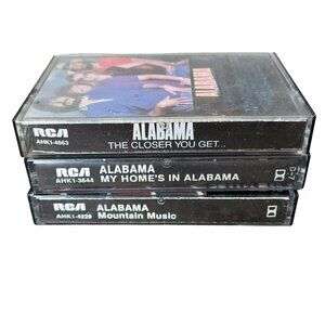 Indulge in a nostalgic musical journey with this vintage cassette tape set by Alabama. Featuring three classic albums—Mountain Music, My Home's In Alabama, and The Closer You Get—these tapes capture the essence of country music from the 1980s. A timeless addition to any collection for fans of Alabama's iconic sound.