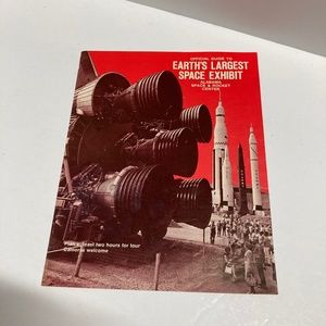 *Vintage Alabama Space and Rocket Center pamphlet. Official Guide To EARTH'S LARGEST SPACE EXHIBIT Alabama Space & Rocket Center. Stapled booklet measures 8.5" x 11" with 8 pages. Tourist guide from the NASA Alabama Space & Rocket Center during the heyday of NASA and the Apollo Space Program at Huntsville, Alabama- Front cover features a real photo image of tourist walking around live NASA rockets on display and is titled: "Official Guide to Earth's Largest Space Exhibit Alabama Space & Rocket Center. Plan at least two hours for tour. Cameras Welcome."