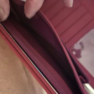 Alabama ,Roll Tide , vintage wallet / card holder. Never used but it was not stored properly. It is intact with one spot on top about the size of the tip of a ball point pen.Front has 2 small blemishes /indentations that do not compromise the covering? You can view it in pictures. Snaps closed with no issues. no gaps. inside is clean with no signs of ever being used. Slim ,compact size, 4 1/2 X 7 1/2. Color is Crimson. : ) Nice wallet for carrying minimal cards ,ID and cash to the games. Roll Tide Roll!
