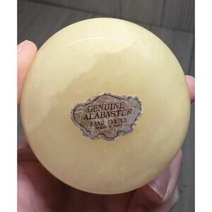 This vintage Alabaster pocket/trinket box features intricate pink rose detailing, adding a touch of Victorian charm to any vanity decor. Made of alabaster, this decorative piece is perfect for storing small trinkets or jewelry while also serving as a stylish addition to your home. Its unique design and classic color make it a lovely oddment for those who appreciate vintage aesthetics and delicate floral motifs.