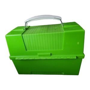 This vintage Aladdin lunchbox and thermos set is a must-have for any collector or fan of retro lunchware. The bright green plastic lunchbox features a classic design, complete with a sturdy handle and latch closure. The matching thermos boasts a sleek geometric pattern and is meant to keep drinks hot or cold.