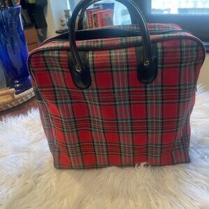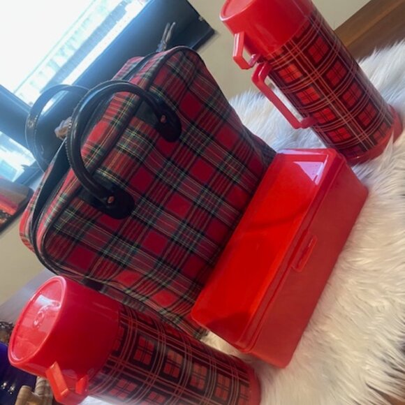 Vintage Aladdin 1970s Red Plaid Lunch Bag with 2 Quart Red Plaid Plastic Thermos( Glass insert) and Red Plastic Snack Box.