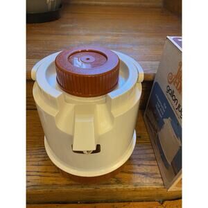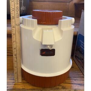 The Vintage Aladdin Pump A Drink 1 Gallon Jug is a collectible piece that is in the box. Made of durable plastic, this thermos features the iconic Aladdin brand, making it a unique and sought-after item for collectors of vintage lunchboxes and thermoses from the 1970s to now. Perfect for adding a touch of nostalgia to any collection or for using as a functional drinkware item.