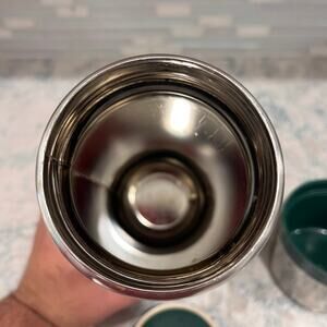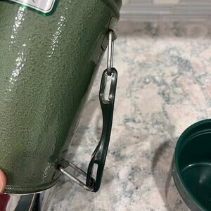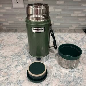Vintage Aladdin Stanley A-1350B Thermos 24 oz wide mouth hammered green stainless steel vacuum bottle. Insulated Lid (doubles as cup), with handle, wide mouth, and leakproof. There are a few paint chips. Please see photos. Otherwise in great condition.