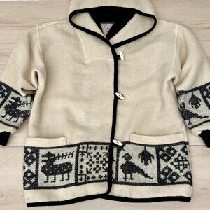 Cream and black with sweet traditional Nordic pattern along the border and cuffs. Black rib knit shawl collar and cuffs. Two front welt pockets.Toggle button closures along the placket are sewn in with backer buttons for stability and durability. Drop shoulders. Unlined and perfect for layering. Big, luxurious, cream-colored hood with black piping (my favorite part!)