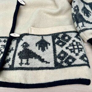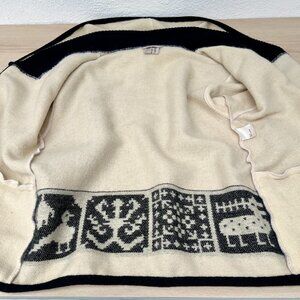 I felt like a Nordic woodland princess when I wore this! No major marks or flaws; two faint spots on the front above the right pocket and one small hole in the black rib shawl collar (shown in pictures). Excellent vintage condition overall for this unique piece, no musty vintage odors, has been dry cleaned and is ready to wear!
