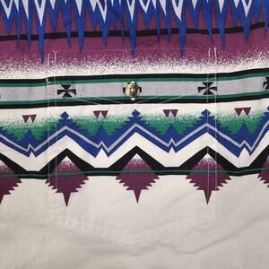Vintage, 90s, Alamosa Aztec print button-down shirt men's XL. Made in the Mexico. There's a small amount of light staining around the button placket area. See the last pic. 3463
