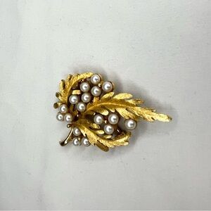 Vintage Alan J Faux Pearl Gold Tone Leaf Brooch Pin Signed