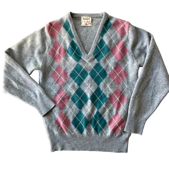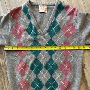 Vintage Macy Alan Paine women's sweater made from 100% luxurious cashmere. Size 38 with a classic argyle V-neck pattern in grey, pink, and green. Made in England and in excellent pre-loved condition — soft, cozy, and perfect for layering.