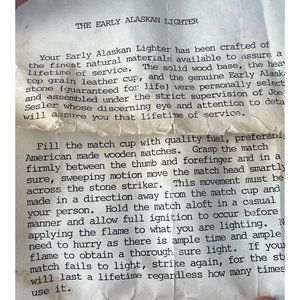 Here for your consideration is a nice piece of Alaskan Art. The bottom says Early Alaska Lighter and artist Joe Sesler Eagle River Alaska. It is a flint rock with a leather cup for your matches. It is mounted on a wood base. There is a paper that came with it to explain the piece more. It does not include the matches. It measures 5" wide and 2.5" tall. It is in good displayable vintage condition. The paper is a but worn and tearing on the history.