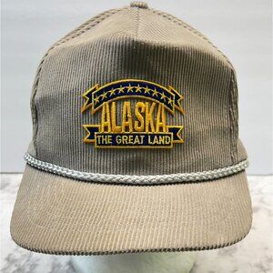 This vintage Alaska "The Great Land" snapback hat features a sturdy corduroy fabric. It's adjustable, offering a comfortable fit for most head sizes. The embroidered design adds a touch of nostalgia, perfect for those with an appreciation for classic styles.