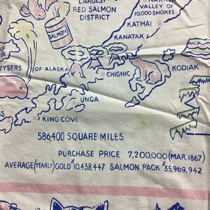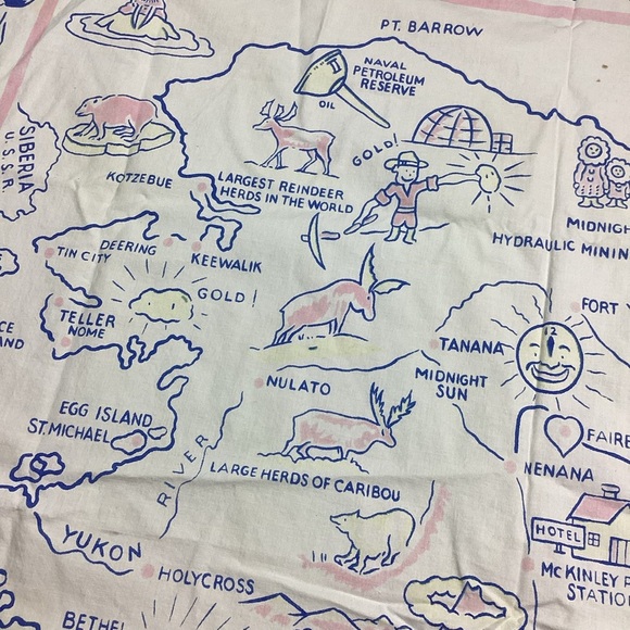 Vintage Alaska State 1950/60s cotton tablecloth. Made in the USA. MCM. Gorgeous white with light pink, yellow, Carolina blue coloring. 47 x 49. High-quality. Rare vintage find. Has a couple of light discoloration marks. Smoke and pet free home. 🇺🇸