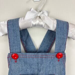Vintage Alben Chambray Turtle Overalls. Baby toddler boy or girl size 18 months. USA made. Light weight blue jean overalls with fun red stitching and buttons. Elasticized waist band and snaps along the legs. "Turtle bum" design on the bib pocket.