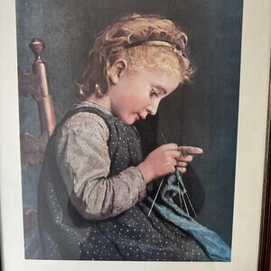 Vintage Albert Anker Girl Knitting Print Framed Wood Rectangular Wall Decoration