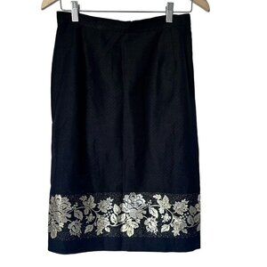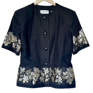 Vintage Albert Nipon Black & Gold Floral Embroidered Linen Skirt Suit Women's 8