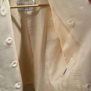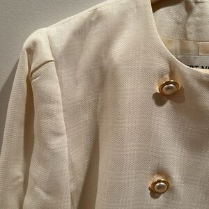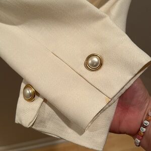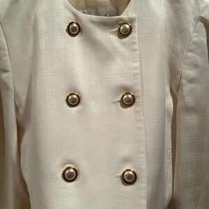Really good condition, small stain on corner of one sleeve, see photo. Beautiful cream check with gold and pearl buttons, no shoulder pads, fits true to size. Statement jacket with all the vintage charm. Recently dry cleaned!