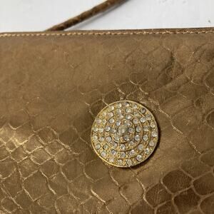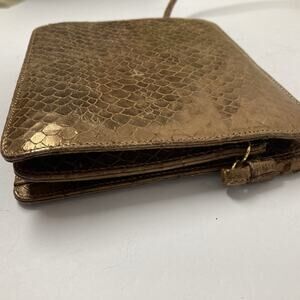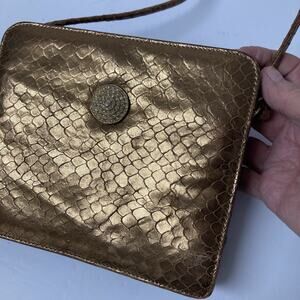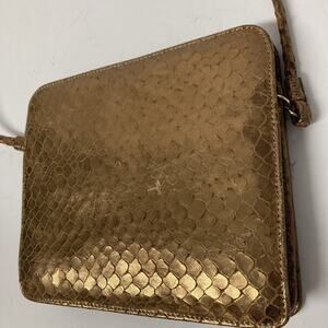Vintage Albert Nipon antique gold evening bag. Snake embossed leather. Strap has 20” drop. Snap closure. Two separate compartments inside plus pocket. Measures 7” wide x 6” high.