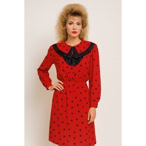 Vintage Albert Nipon Red Polka Dot Dress with Black Satin Collar & Bow – Made in Japan, Size 2