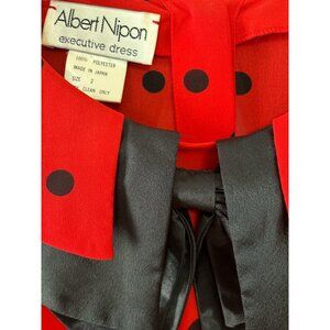 Elegant vintage 1980s Albert Nipon “Executive Dress” featuring a striking red fabric with black polka dots and a dramatic double-layered black satin collar with an attached bow tie. Made in Japan from soft, lightweight polyester, this timeless piece blends playful charm with sophisticated tailoring. The gathered waist, button cuffs, and back button closure complete this refined silhouette—perfect for collectors or lovers of bold retro style.