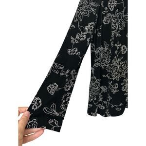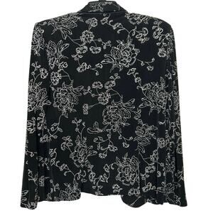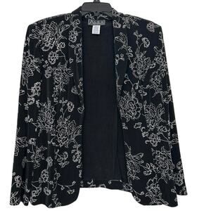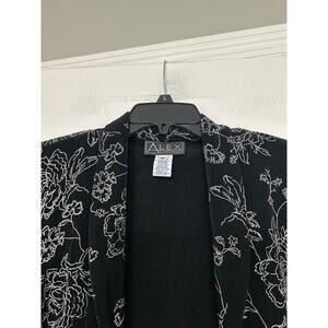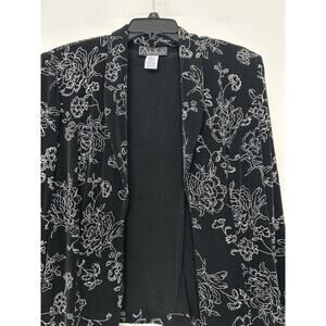Elegant and timeless, this Alex Evenings open-front jacket features a beautiful black knit fabric with metallic silver floral thread detailing. Perfect for special occasions, evening events, or adding a touch of sparkle to a classic outfit.