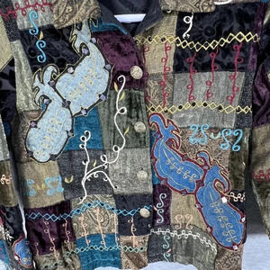 Vintage jacket Patchwork design Women's fashion Embroidered jacket Medium size Multicolor jacket Button-up jacket Velvet fabric, Artistic design Collared jacket Long sleeve jacket Polyester blend Unique patterns