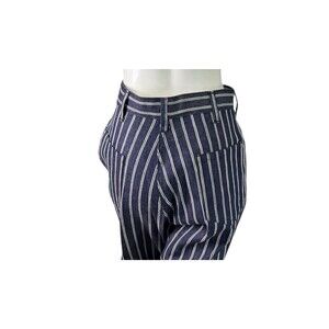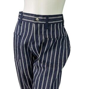 This is a rare pair of vintage c.1960's-1970's Sanforized blue and white hickory striped denim 'flair bottom' jeans from Alexander's. Front and back patch pockets. Made in British Hong Kong. 100% cotton. These are high rise jeans with a narrow waist, that is loose in the hips and the bottom is flared. Excellent, like new condition. Appears unworn. Marked as a women's size 14, but please review the provided measurements as contemporary sizing is closer to a women's size 6-8. Measurements;
