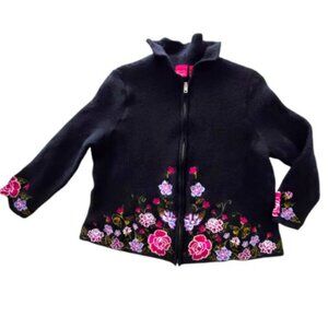 Vintage Alexandra Bartlett Black Wool Floral Embroidered Zip-Up Cardigan Jacket
