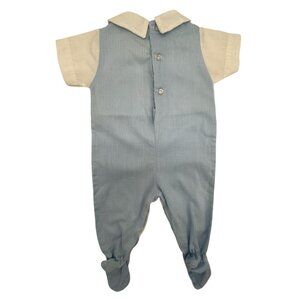 This classic vintage Alexis overall set features charming blue pinstripes and a soft beige shirt with a Peter Pan collar. Made for infants weighing 6-10 lbs, this outfit combines style and comfort.