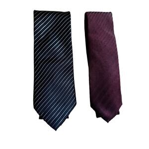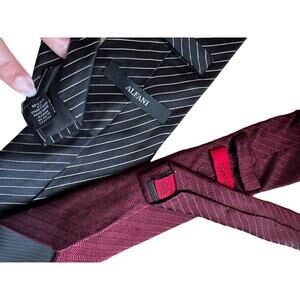 Pair of 90s silk neckties from Alfani. One is black with thin silver stripes and is a traditional size tie. The other is a burgundy or maroon skinny tie with patterned stripes. There are some minor snags on the burgundy one, otherwise excellent condition. Cleaned and stored in a smoke free home.