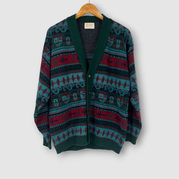 Vintage Alfonso Poso Sweater Studio Cardigan Knit Green Red Blue Pattern