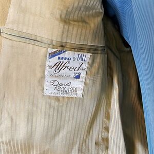 Step up your fashion game with this vintage Alfred Big & Tall Southwestern Tan Suede Blazer. The suede material gives the blazer a luxurious feel while the Southwestern design adds a touch of elegance. Perfect for any occasion, this blazer is a must-have in any fashion-forward man's wardrobe. The blazer is in excellent condition and has been well-maintained for its age. It features a regular jacket/coat length and a chest size of 42 inches. The blazer is a size 42 and fits big and tall men comfortably. Don't miss out on this unique piece that will make you stand out in any crowd.