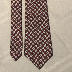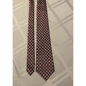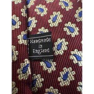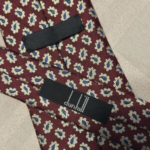 Elegant vintage Alfred Dunhill London tie, handmade in England from pure silk. Features a rich burgundy jacquard weave with repeating gold and blue floral medallions. Fully lined with the Dunhill London logo and marked All Silk Dry Clean Only Made in England. A fine example of British craftsmanship and timeless style.