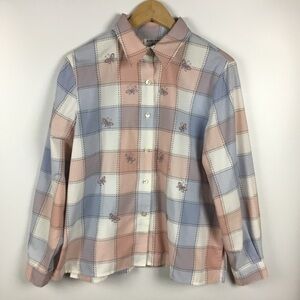 Vintage Alfred Dunner Button Down Plaid Embroidered Butterfly Shirt. Pale pink, blue and white plaid.