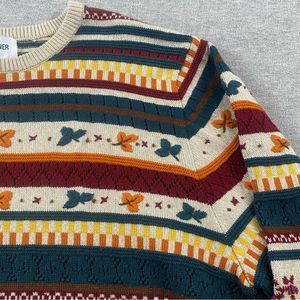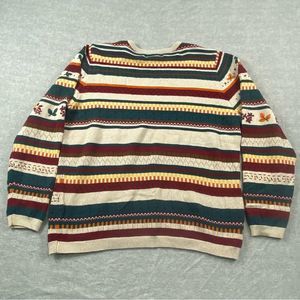Vibrant crew neck sweater with multicolor stripes. Features some fun fall leaf patterns. Perfect for casual wear.