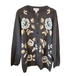 Vintage Alfred Dunner Floral Embroidered Wool Blend Cardigan Sweater Large Gray