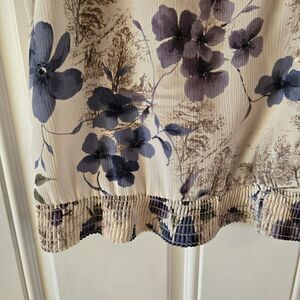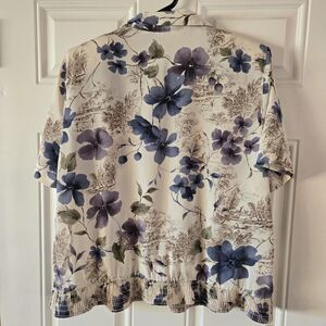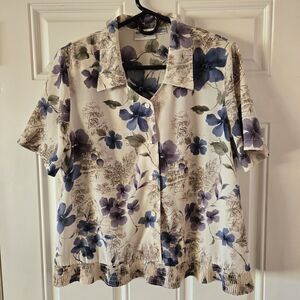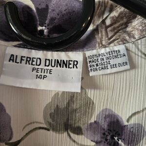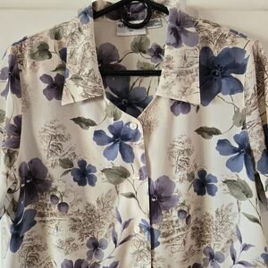 vintage Alfred Dunner petite blouse in size 14P. Featuring a beautiful floral print in shades of purple, blue, and taupe on a soft cream background, this blouse is perfect for any season. The lightweight crinkle-textured polyester fabric offers comfort and easy care, while the shoulder pads add a touch of structured vintage elegance. Approximate measurements flat lay 24" Pit to pit 22"